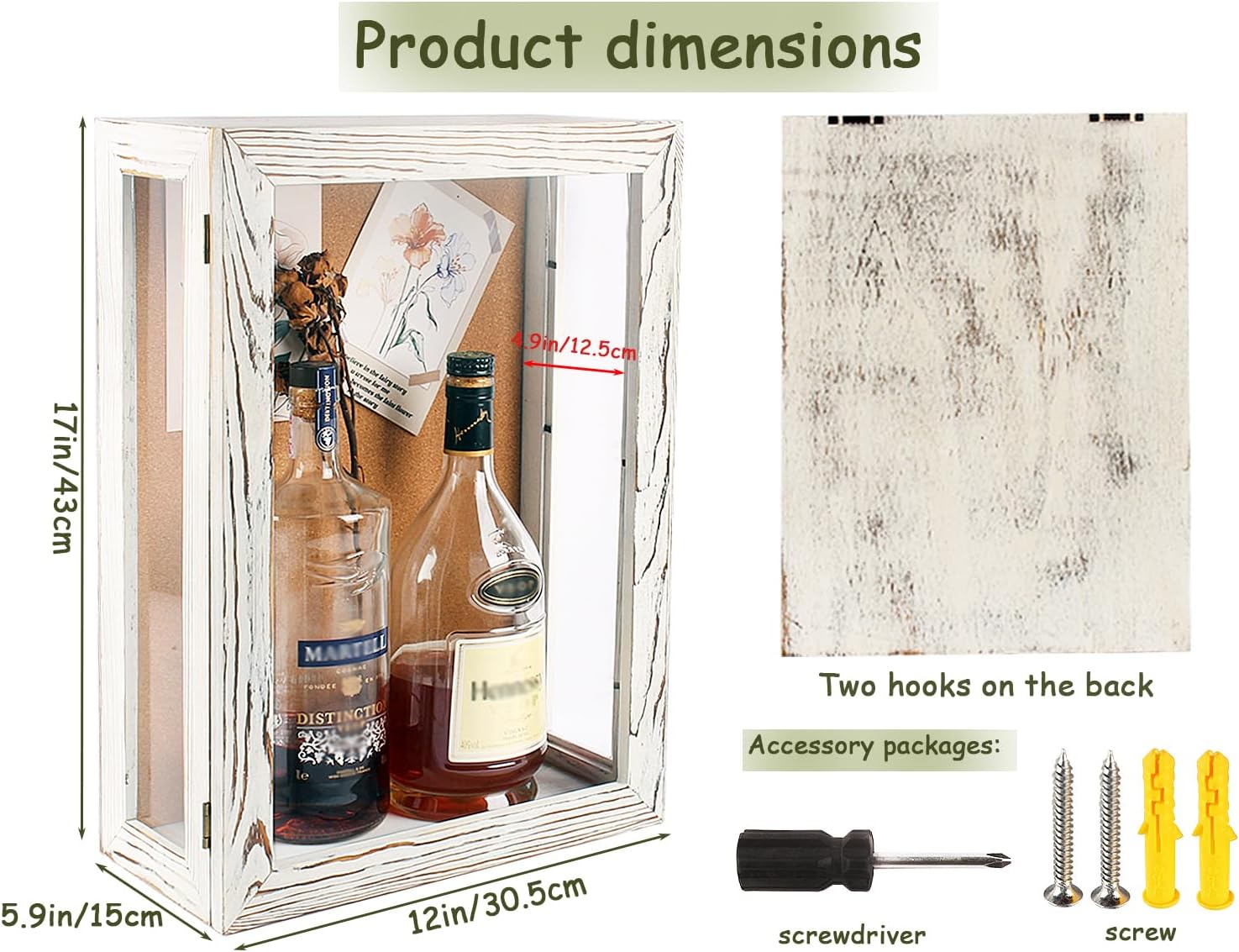 Imagine the temptation of a sophisticated display that transforms your cherished wine and whiskey bottles into the stars of your home. Our triple acrylic display caseis more than just a shadow box; it's a statement piece that captivates with its sleek black frame and crystal-clear, triple-sided acrylic panels, offering a panoramic view of your collection from every angle. With a secure magnetic buckle system, your prized bottles are safeguarded, while the grace wall-mount design saves space and adds a touch of modern luxury to any room. Personalize the interior with our corkboard lining, allowing for a damage-free arrangement of mementos and decor. Boasting a generous 12X17x6inches, this display case is spacious enough for three wine bottles or two whiskey bottles, making it the perfect addition to your home bar, wine cellar, or living room. Choose between classic black or rustic white to match your decor, and elevate your collection with a display that's as timeless as it is tasteful.