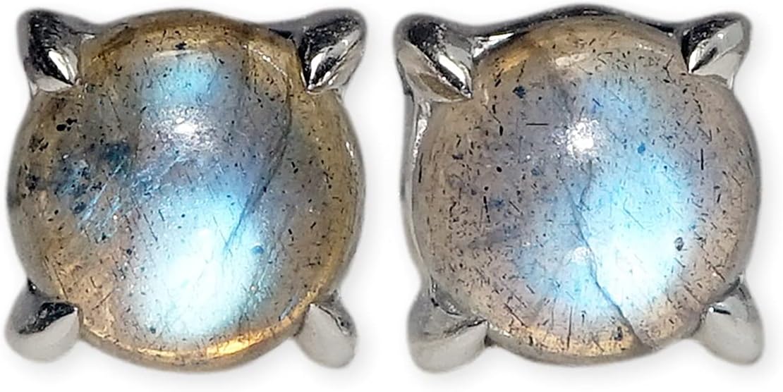 These stud earrings are handmade with beautiful genuine Rainbow Moonstone round shape cabochons and 925 Sterling Silver. Note: Our gemstones are hand selected by our team, for the perfect match of color, clarity and cut.