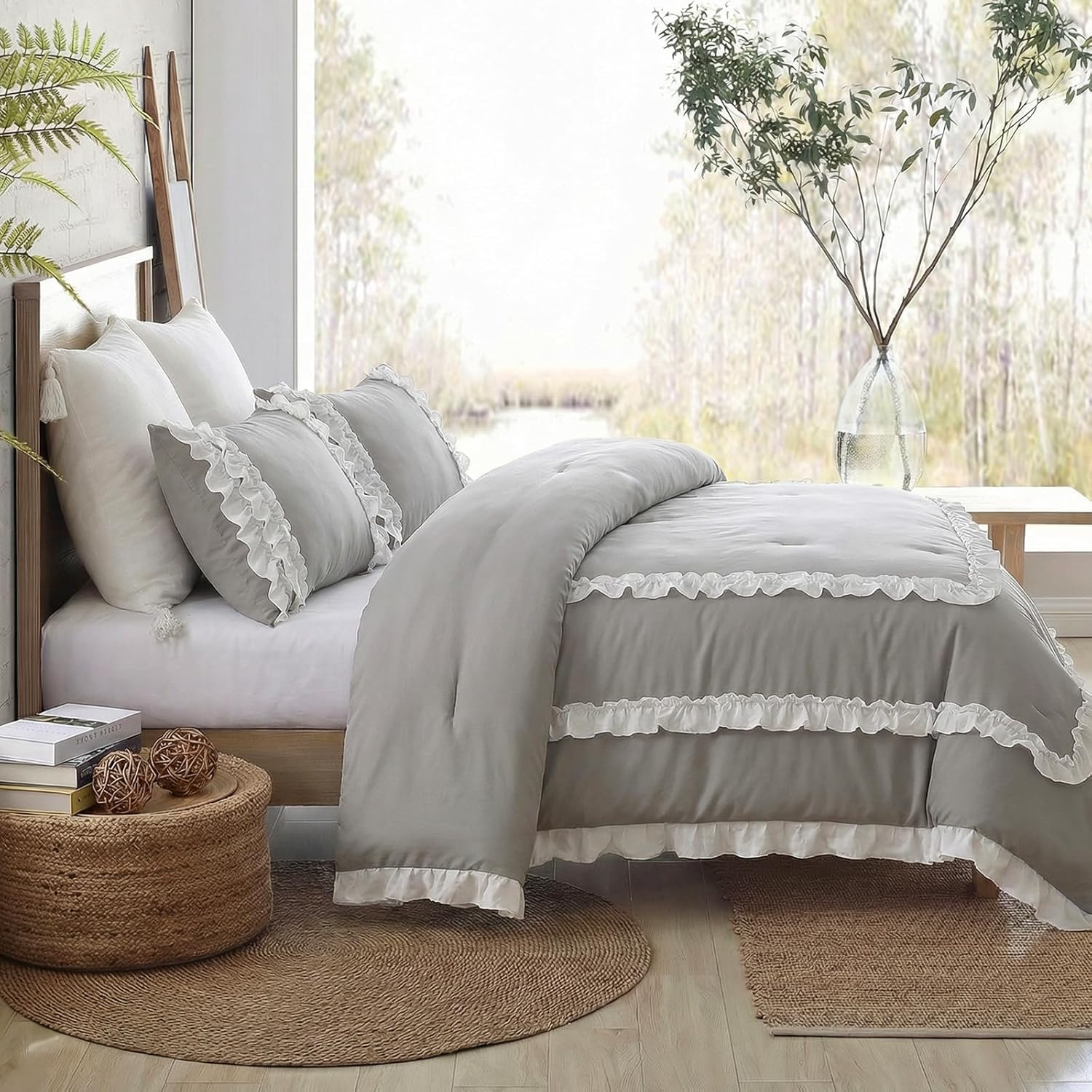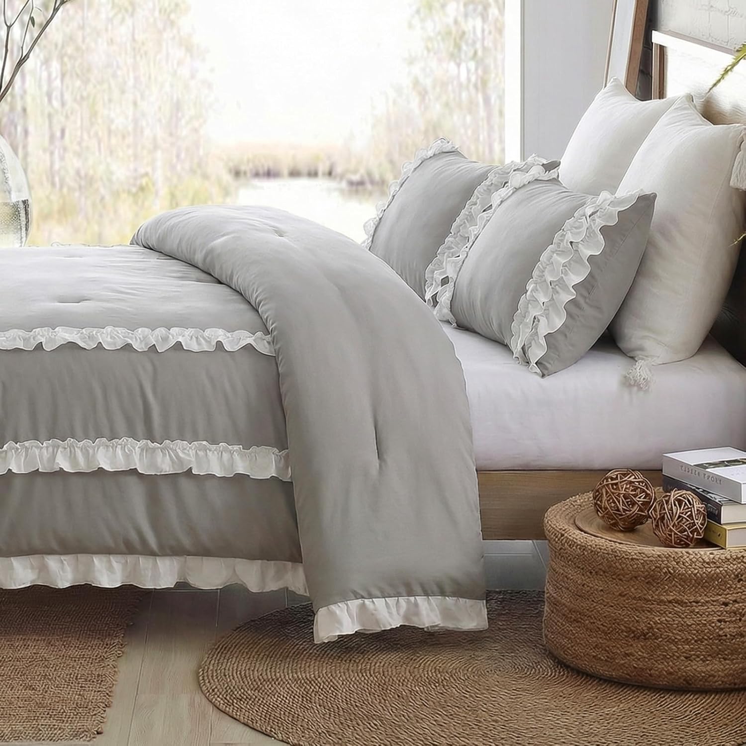 Ruffle Comforter SetPackage Includes: ComforterMatching Pillowcases(Tips: twin size has only one)Size InformationTwin Size- 1 Comforter: 66"x90"; 1 Standard Pillowcase: 20"x30"Queen Size- 1 Comforter: 90"x90";2 Standard Pillowcases: 20"x30"King Size- 1 Comforter:104"x90"; 2 King Pillowcases: 20"x36Warm TipsOwing to be packaged on a small package, it might be some wrinkles when you receive it. You can put it in the dryer on low heat to help take the wrinkles and will come out fluffy.
