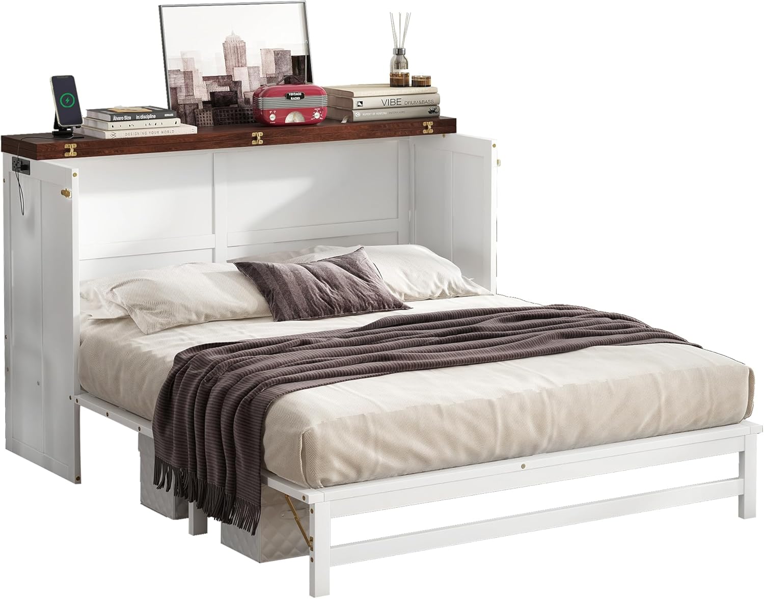 Description Product Type:Murphy Bed Size:Queen Color:Walnut/White Material (main):Pine + MDF + PB Spring Box:No need Assembly Required:Yes Manual and Hardware:Yes Technical Details Overall Product Dimension Cabinet: 63.6” L x 24” D X 41.2” H Bed: 81.6” L x 63.6” W x 41.2” H Overall Product Weight:152.8 lbs Bed Weight Capacity:500 lbs Suggested Mattress Style: 3-fold mattress / Thickness:6 inches or less Style: 4-fold mattress / Thickness:4.5 inches or less Notes:Manual measurement has been used,there may be some reasonable error.All the pictures are taken by actual samples, slight chromatic aberration may occur due to lighting or display.