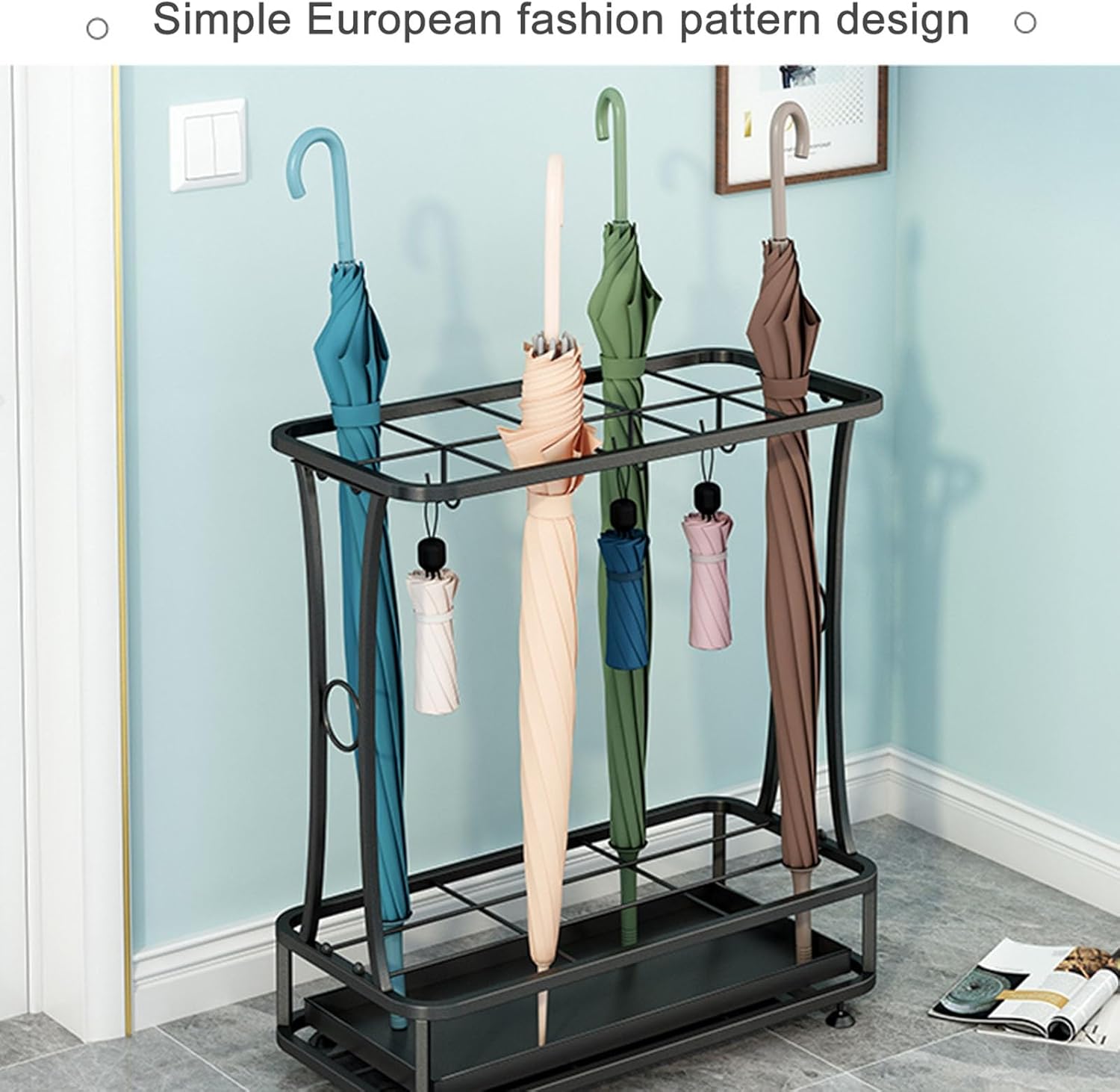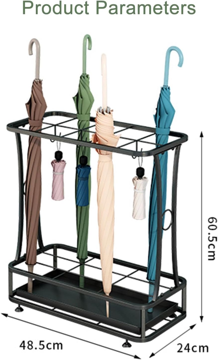 Enhance your entryway organization with our commercial-grade metal umbrella stand. This spacious umbrella holder is designed to tackle your storage challenges while adding a touch of elegance to your space. Versatile Design: Featuring a grid top section, this stand accommodates umbrellas of various sizes upright, ensuring they are easily accessible. Additional hooks are ideal for hanging smaller foldable umbrellas or accessories like keys. The bottom tray effectively collects any drips, safeguarding your floors from water damage.Easy Assembly and Maintenance: With straightforward instructions, you can quickly set it up. The smooth metal surface is easy to clean with just a quick wipe, keeping it looking pristine. Product Name: Metal Umbrella Stand for EntrywayMaterial: IronColor Classification: BlackDimensions: 48.5 x 24 x 60.5 cm / 19 x 9.4 x 23.8 inchesStyle: Simple and ModernNote: As product dimensions are manually measured, there may be slight variations. Color differences may occur due to varying resolutions and monitors. If you experience any issues upon receiving your package, please reach out to us.
