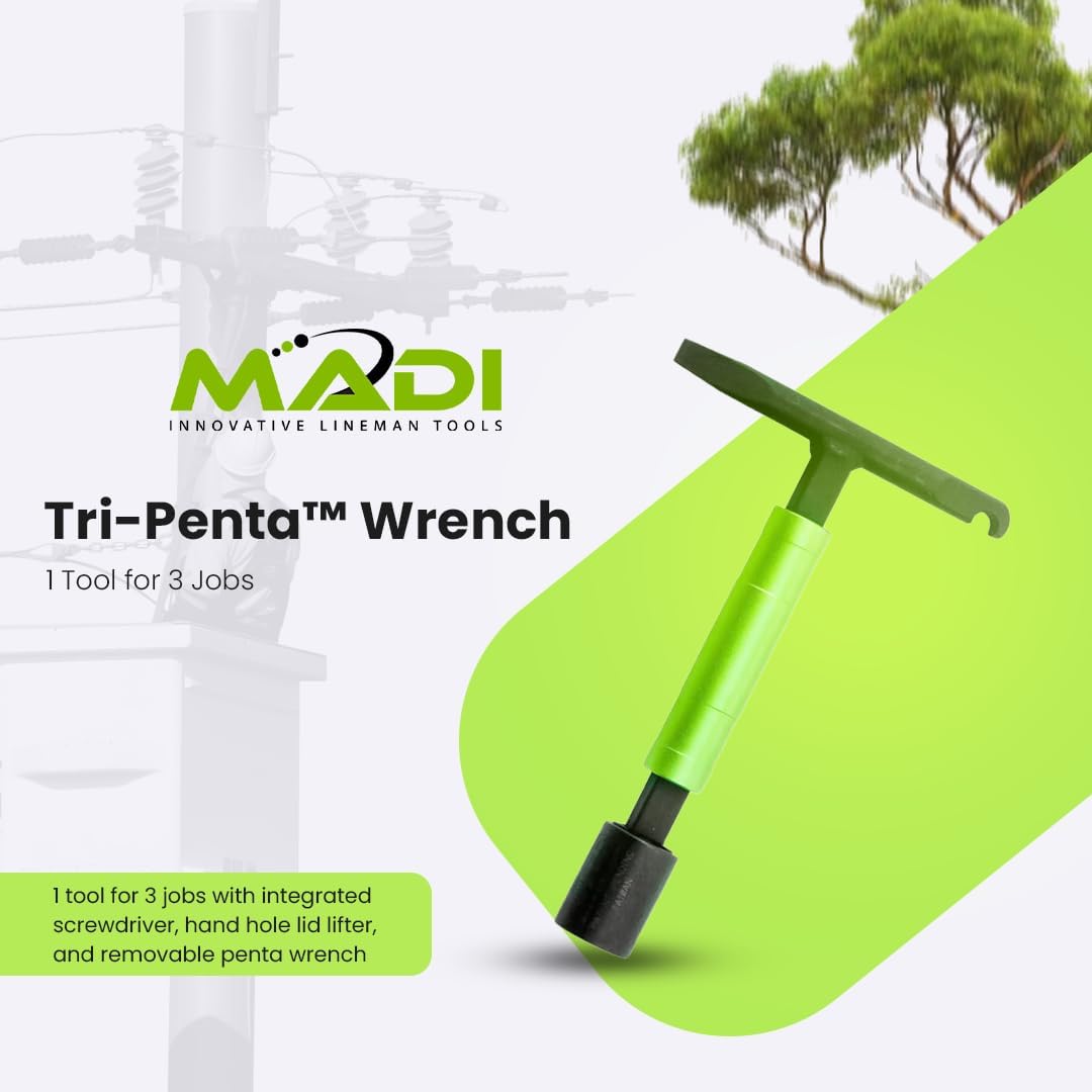 This underground utility wrench combines three everyday functions into one convenient tool. The ¾” Penta Socket opens transformers and switch gears. The addition of a high visibility patent pending Speed Sleeve helps linemen open those transformers and switch gears up to 2X faster than standard penta sockets or wrenches. It also comes with 2 other tools built into the handle – the integrated Lid Lifter lifts hand hole lids and the 3/8” Screwdriver is great for opening secondary or primary doors. Main Uses: Screwdriver – 3/8” screwdriver for opening the primary door on 3 phase transformers Removable Penta Wrench – Designed for opening all transformers & switch gears Hand Hole Lid Lifter – Built-in design for lifting hand hole lids Additional Features: Speed Sleeve – The green handle spins freely to open transformers & switch gears 2X faster Life & Durability – Heat-treated alloy steel Removable Penta Wrench – Designed for opening all transformers & switch gears