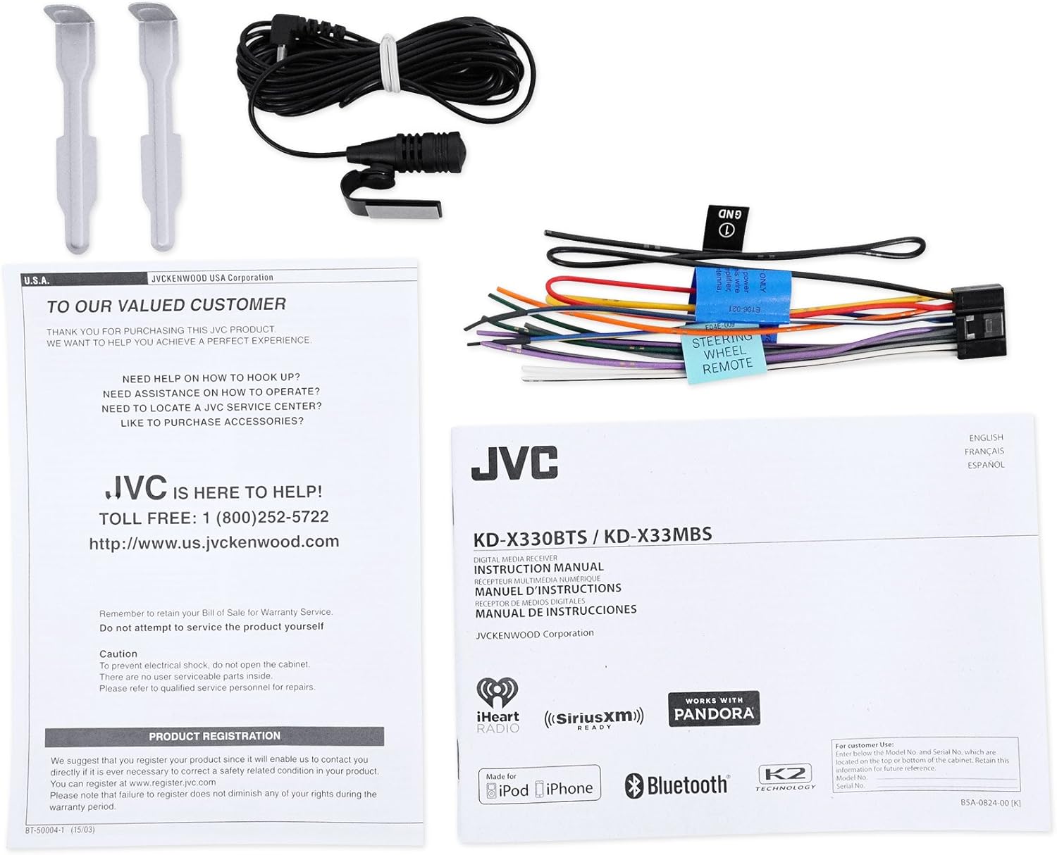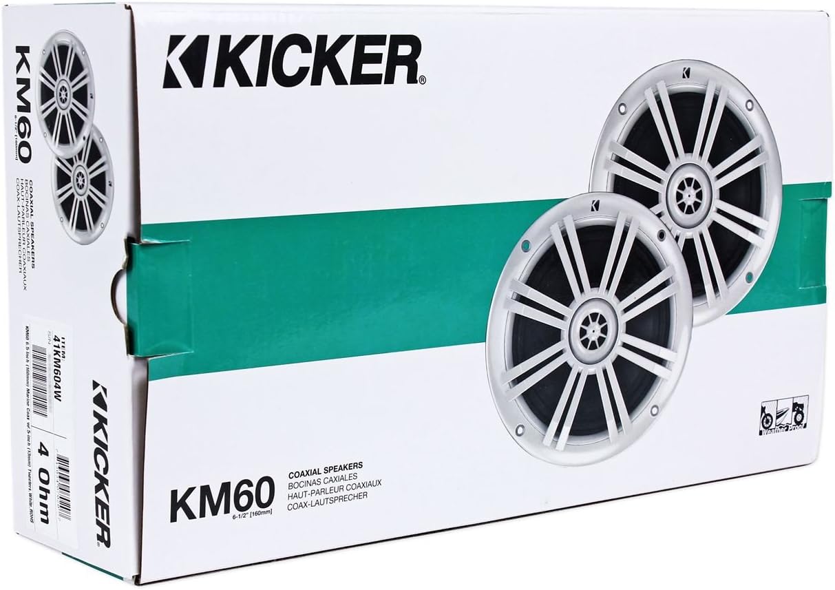 Digital Media Receiver: AUX/USB Inputs MOSFET (22 watts RMS/50 peak x 4 channels) Backlit Display Conformal Coated PCB 13-Band EQ 2-Zone Variable-Color Illumination JVC Remote App Compatibility 4.0V High-Voltage 3 Pre-Outs Space Enhancement Sound Response Sound Lift Audio Streaming Control iPhone Bluetooth Automatic Pairing 2-Line VA LCD Display High Current 1.5A Charging Satellite Radio Ready Wired Remote Control (Optional) Steering Wheel Remote Control Ready AM/FM Tuner 18FM, 6AM Preset Stations MP3/WMA/WAV/AAC/FLAC Playback Bluetooth Built-In 6.5" Speakers: Pair of Kicker 41KM604W 6.5" 4-Ohm 2-Way Coaxial Marine Speakers Power Handling Per Speaker: 150 Watts Peak/50 Watts RMS Power Handling Per Pair: 300 Watts Peak/100 Watts RMS 2-Way Design Santoprene® surrounds Woofer Size: 6.5" Woofer Composition Polypropylene Tweeter Size: 1/2" Tweeter Dome Material: PEI (Polyetherimide) Impedance: 4-Ohms Sensitivity: 90dB Frequency Response: 35-21,000 Hz Cutout Dimensions: 5.18" Top-Mount Depth: 2.5" Grilles: White Only sealed motor structure and locking terminal covers white grilles 1/2" PEI film dome tweeter with neodymium magnet UV-treated polypropylene woofer with Santoprene rubber surround