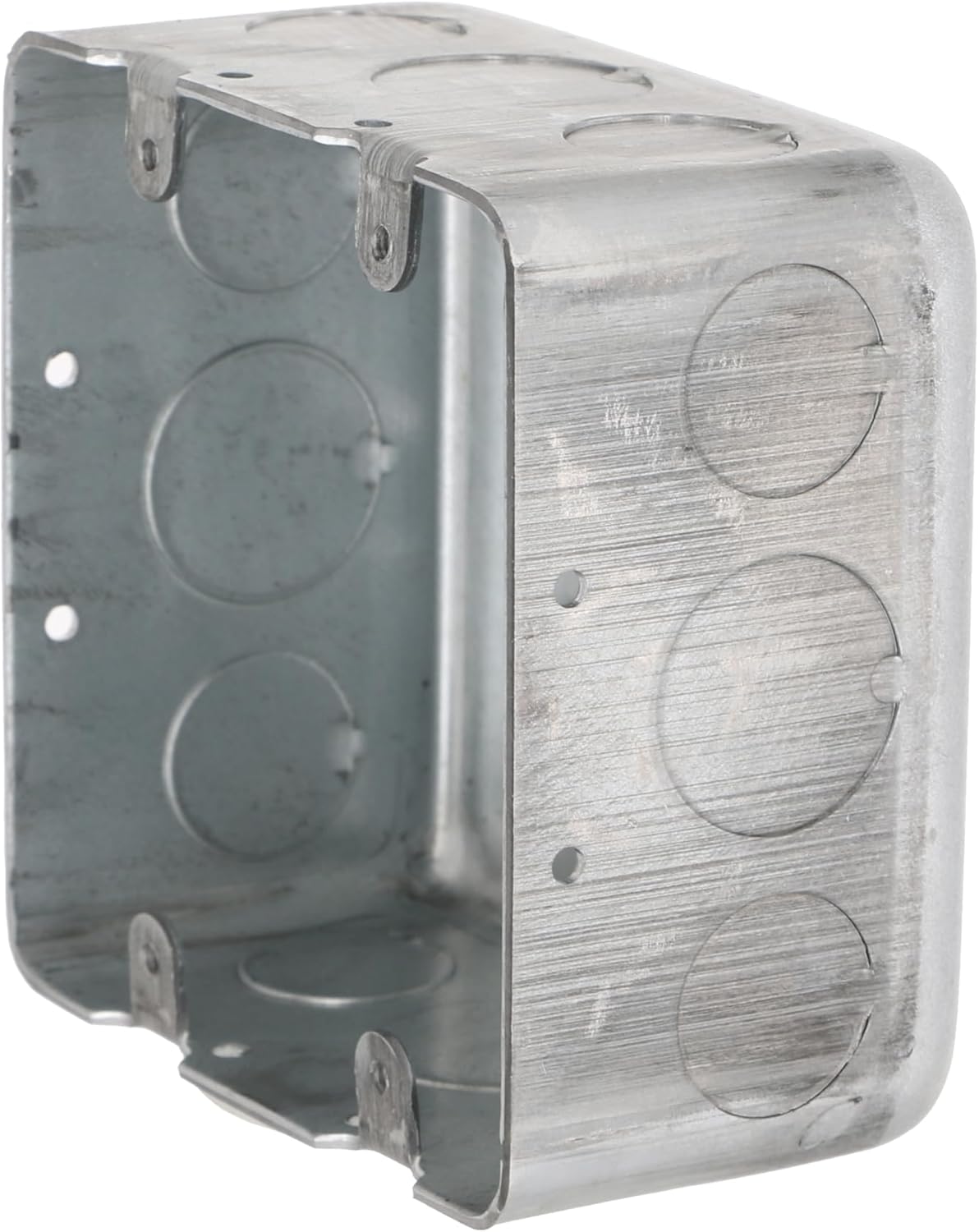 RACO 683SP drawn switch box, 4 in. square x 2-1/8 in. deep. Box has eleven 1/2 in. and six 3/4 in. knockouts. Popular for exposed work applications (surface mounting may require conduit).