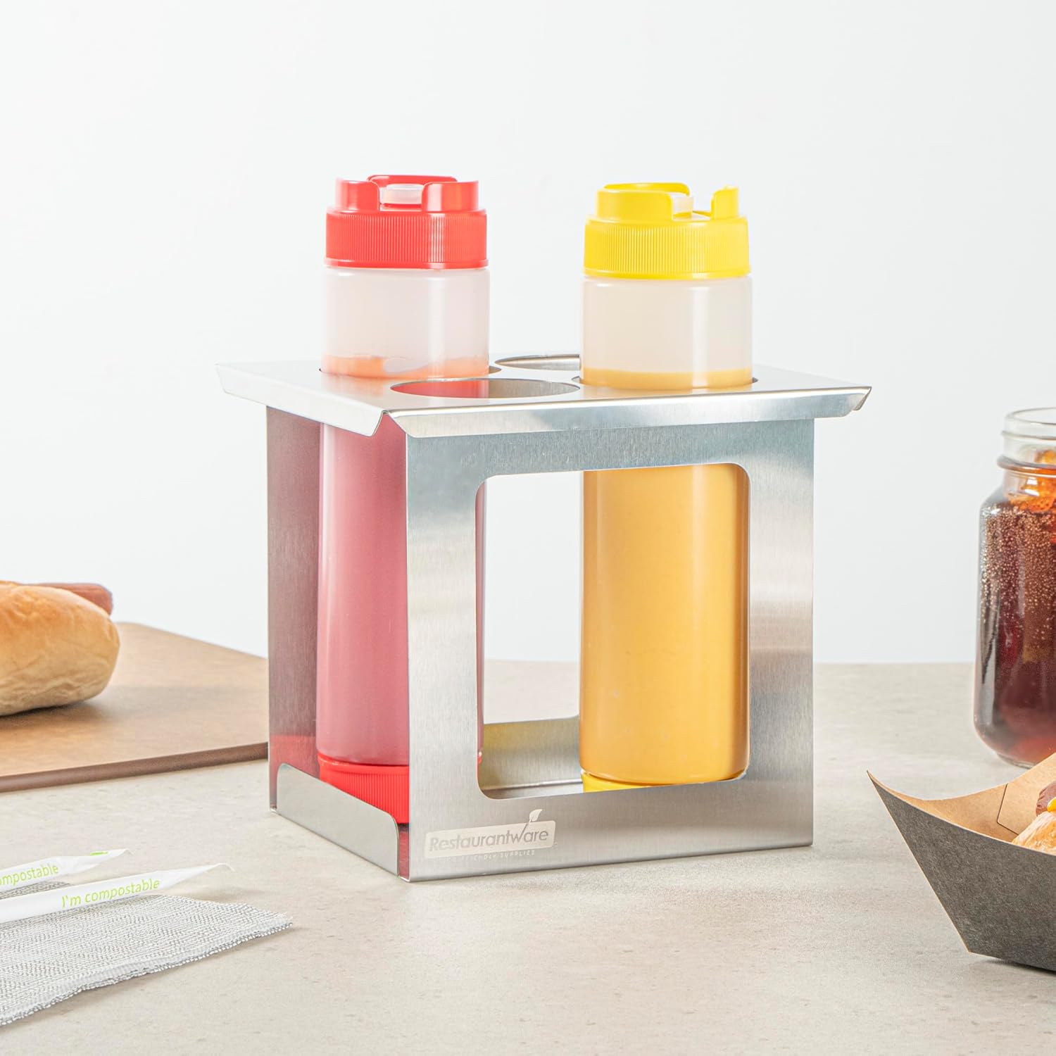 Streamline your condiment station with effortless organization. The Met Lux Squeeze Bottle Holder maintains organization of bottles in prep areas, keeping your kitchen neat and efficient. Constructed from durable stainless steel, this holder ensures longevity and resistance to corrosion, making it ideal for high-traffic kitchen environments. Designed to fit 1/6 size openings, it seamlessly integrates into standard kitchen setups, optimizing space as a condiment bottle holder. Its compact dimensions of 6 1/4 inches by 7 inches by 6 1/4 inches maximize counter space while providing ample storage capacity for your squeeze bottle organizer needs. The dishwasher-friendly design saves time on cleanup duties, promoting hygiene and reducing maintenance time. Enhance your workflow with this indispensable kitchen tool and experience the ease of a well-organized condiment station. Sold in a 1 count box.