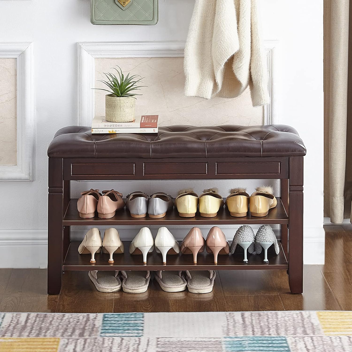 HOOTSMALL Shoe Storage Bench with Cushion, Entry Bench with Storage Solid Wood Shoe Bench Ideal for Entryway Living Room and Corridor (Brown, 31.5'')