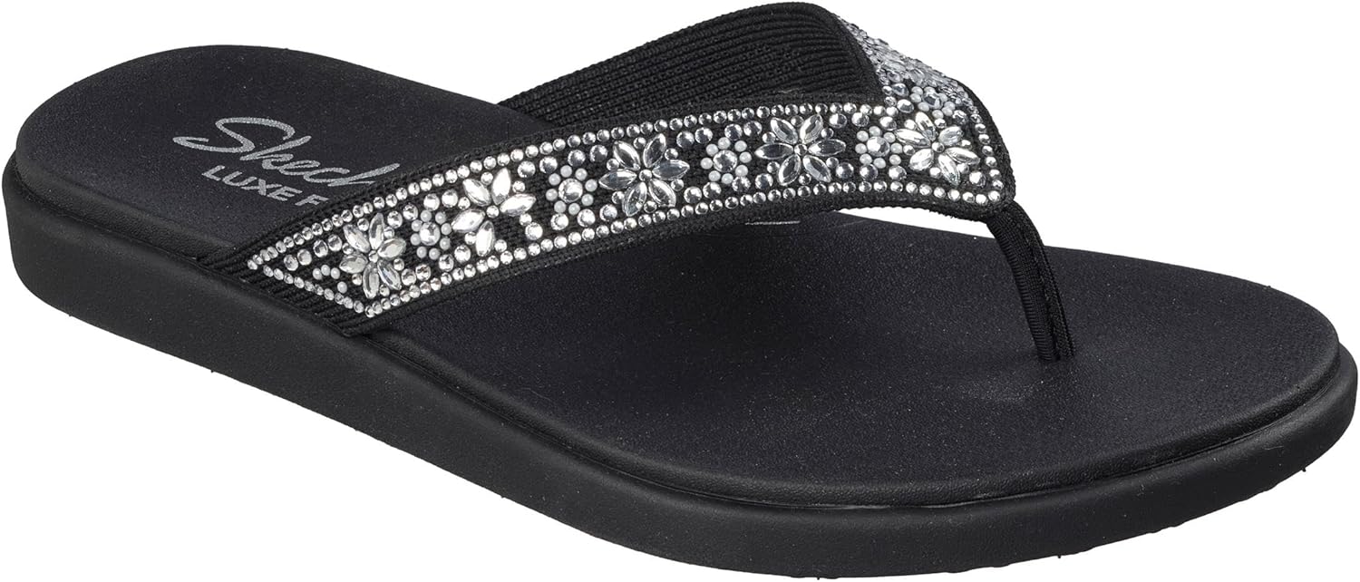 Elevate your warm-weather style with the Skechers MEDITATION LUXE - SUNNY GLOW. Featuring a plush Luxe Foam footbed for luxurious comfort, these womens sandals are adorned with elegant floral rhinestone and pearl embellishments on the straps. The vegan-friendly construction makes them an ethical choice, while the classic thong silhouette ensures versatile wear from casual days to night outings. Sandals for women have never looked so chic and comfortable.