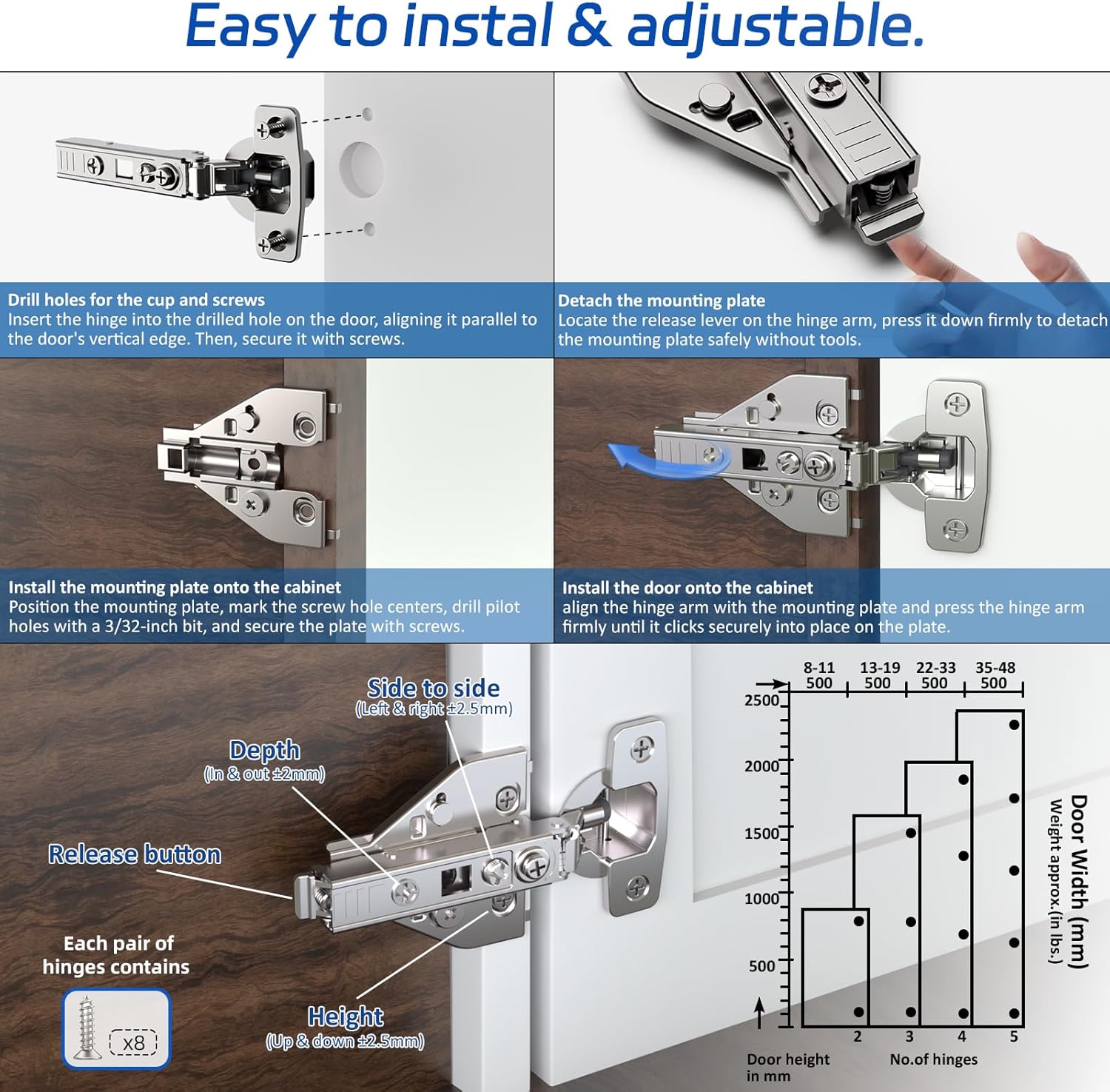 Our soft close hinges are designed to minimize noise and ensure a smooth, quiet closing experience. Made from durable materials, these concealed hinges provide reliable, long-lasting performance. Suit for kitchens, bathrooms, or office cabinets, they bring a sleek and modern touch to most space. Suitable for both frameless and overlay cabinets, making them adaptable to various styles.Virtually invisible when the cabinet is closed, offering a clean and polished look.Simple to install and adjustable to ensure a proper fit for different cabinet doors.Helps reduce wear and tear on cabinets, extending their lifespan over time.This is an ideal solution for those seeking to reduce noise and improve cabinet performance, while maintaining a streamlined and stylish appearance.