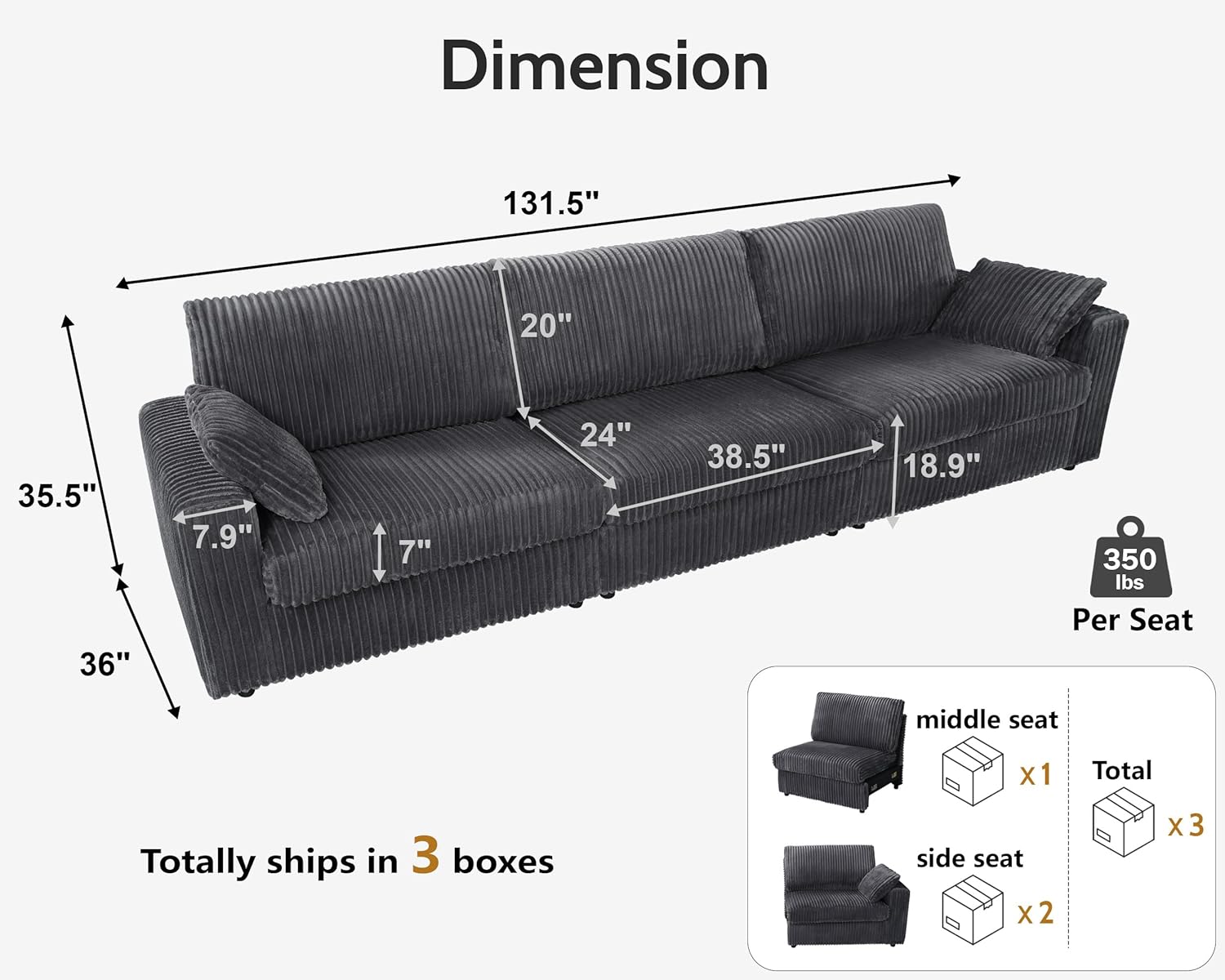 WEUP 131" Large Modular Sectional Sofa, Plush Corduroy Modern Oversized 3 Seats Sectional Couch with Two Pillows, Tool-Free Assembly (3 Seats, Dark Grey)