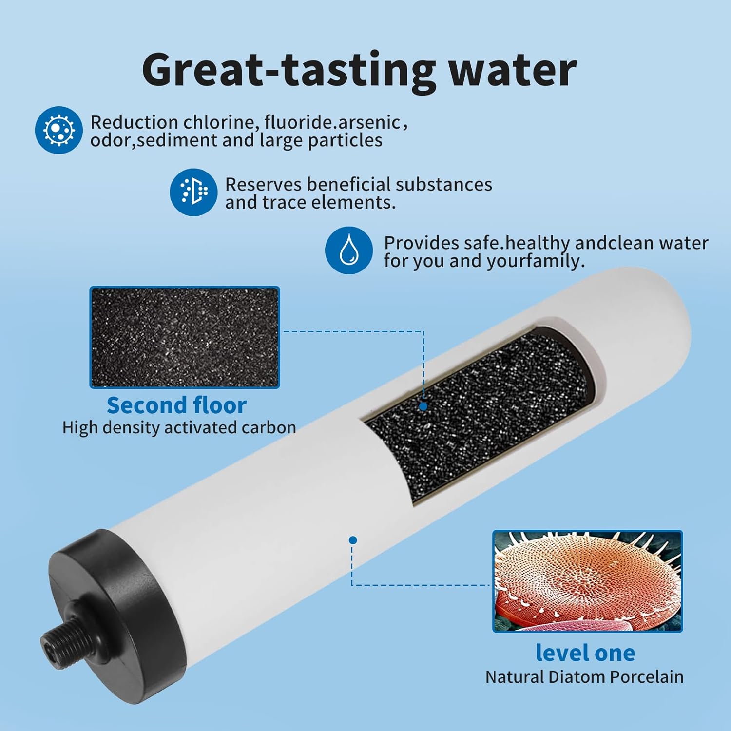 | Product Benefits | Reduces chlorine, taste, and odor; removes impurities such as rust sediment; provides 6000 gallons of fresh water |