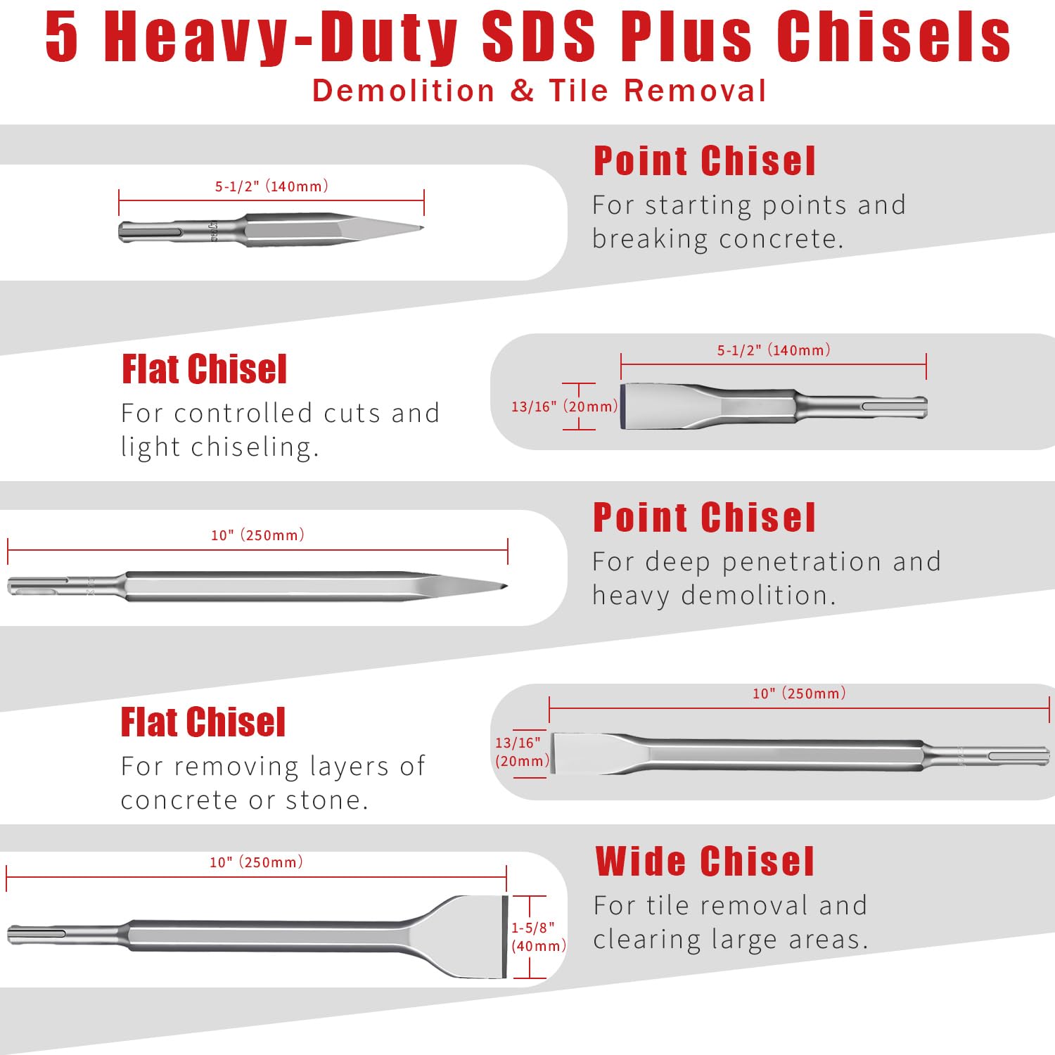 • More Than Drill Bits – Chisels Included – Go beyond drilling. With SDS Plus chisels (point, flat, and scaling), you can remove tiles, break concrete, or carve masonry. One kit does it all, from precise holes to heavy-duty demolition.