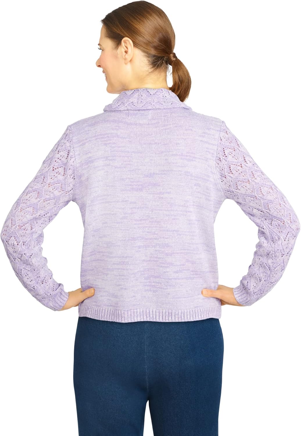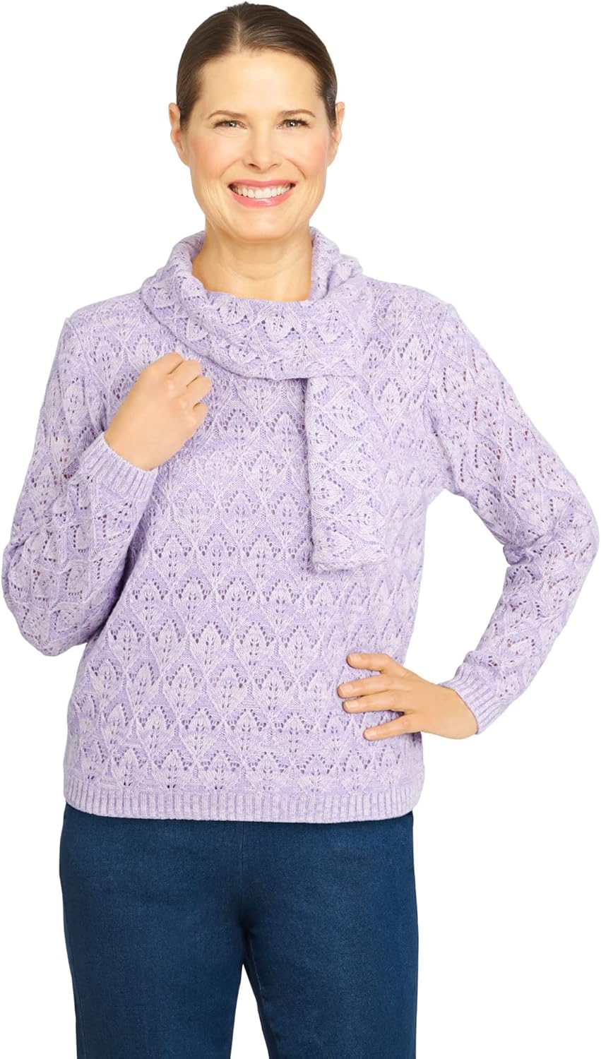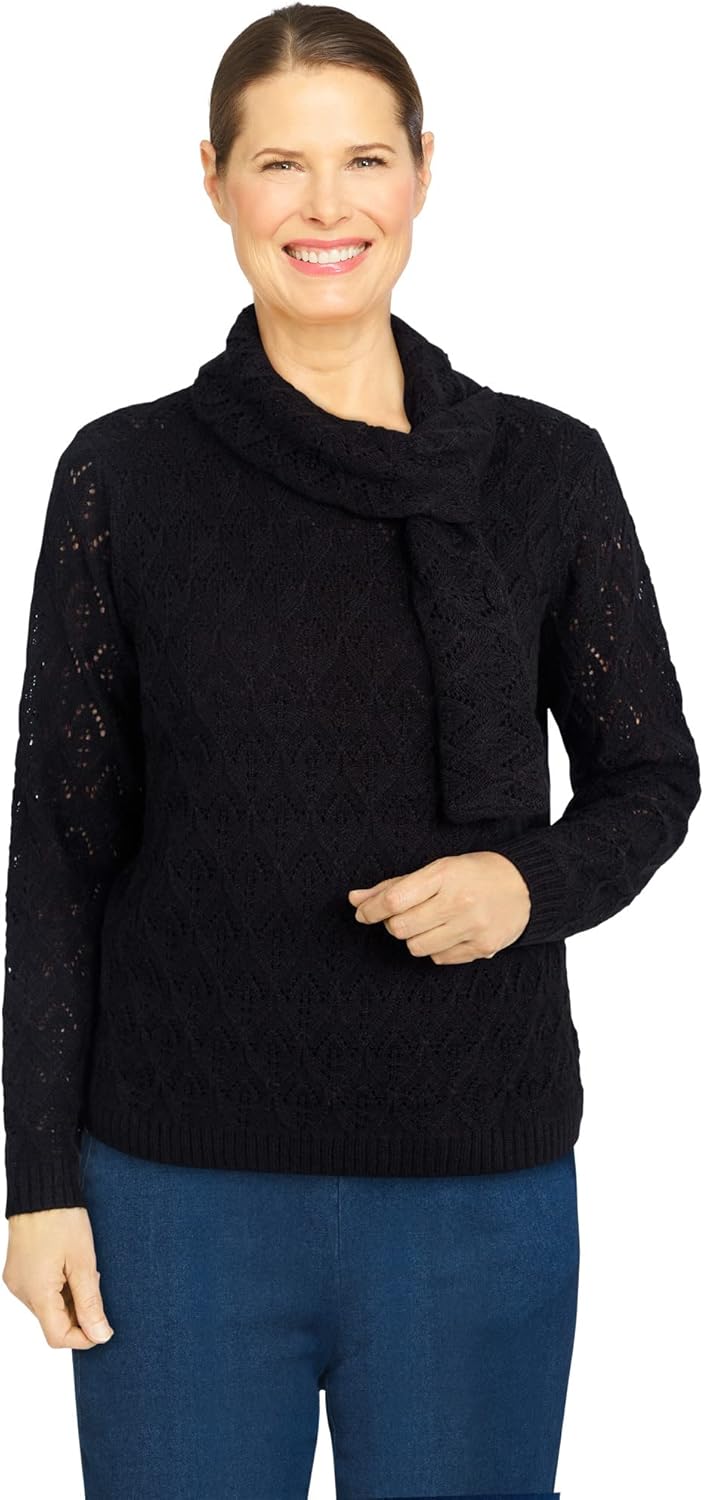 For a fabulous put together look, reach for this gorgeous sweater. This body-lined style is designed with feminine pointelle stitching and a unique scarf at the neckline to keep you looking classy.