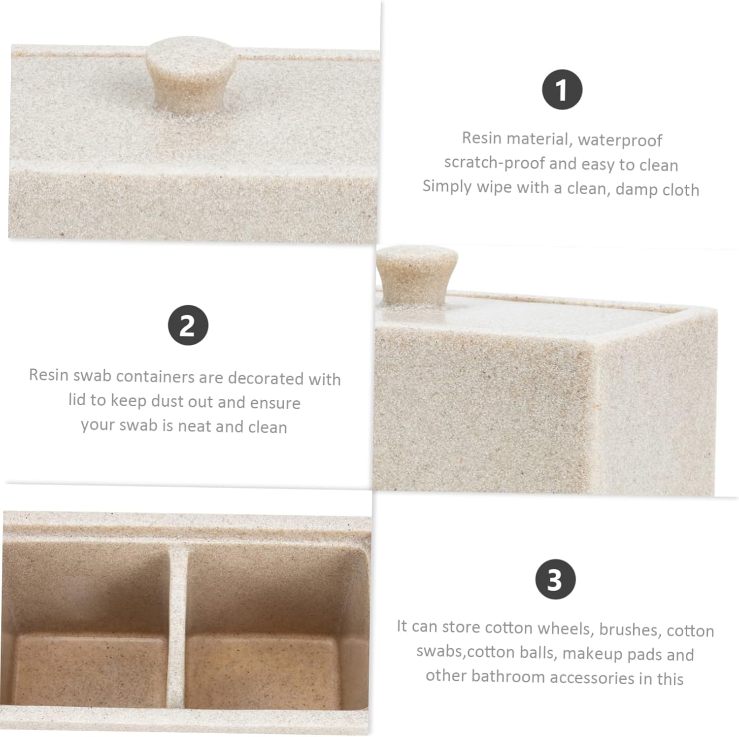 Package List 1 x storage box Features - Material: Resin Makeup Cotton Organizer - Will enable to show your great fashion taste, great resistance safeguards against damage and injury tampon flask. - You could save the precious space on your dressing table, desk or in your drawer bathroom jars. - It is easy to clean with water or wipe clean with a cloth plastic containers. - It is divided into 2 slots for storage of things you want, the divider can be taken out to fit larger items cotton swab holder. - Made of resin material, very and reliable for a long period cotton ball holder.Goods Descriptionmakeup storage The box is particularly designed for storing cotton swabs, , makeup pads, powder puff or other daily necessities.swab organizer It can keep all of its contents protected and dust- .cotton swab organizer The box is safe and to use