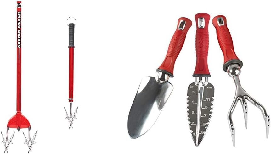 Garden Weasel 2-in-1 Rotary Cultivator 91206 - Garden Tiller with Detachable Tines - Manual Hand Ground Tiller - Weather and Rust ResistantGrow, and maintain your lawn and garden with the Garden Weasel Cultivator and Hand Tiller. This time-saving tiller cultivates soil to a depth of 1.5", loosening topsoil and prepping beds or bare areas of lawn for seed. It's ideal for large garden beds and small raised beds, easily adjusted from a short tool to full sized tool in seconds. The tines are also removable for precise tilling. It's fabricated from carbon steel, has a comfortable grip, and includes a metal loop on the handle for easy storage in the garage or shed. This soil tiller makes the perfect gift idea for any homeowner who loves to garden and takes pride in their lawn.Garden Weasel 3-Piece Hand Tools Combo Set 91370-Q - 3-Piece Garden Tool Set - Hand Shovel, Transplant Shovel and Hand Rake - Gardening Gifts for Women and Men - Weather and Rust ResistantAchieve the garden of your dreams with the Garden Weasel 3-Piece Hand Tools Combo Set. Ideal for indoor house plants and outdoor gardens. Dig, cut, remove weeds, and transplant quickly and efficiently with less fatigue. The set includes a multi-use transplanter with a convenient scale that measures inches and centimeters, a trowel for digging, and a tiller for loosening the soil. These metal garden tools are durable, lightweight, and rust-resistant. They measure 12.75" long, feature a non-slip textured comfort grip, and are easy to clean. Add this must-have set to your gardening tool bag and indoor gardening tools. Surprise your flower and plant-loving family and friends and gift these handheld garden tools for any occasion.