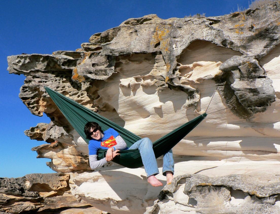 Hammock Bliss is compact, lightweight and ready to go anywhere. This incredible hammock has so much room it is significantly larger than a double size bed. It measures an amazing 57 inches x 118 inches, which is 4 foot 9 inch wide by 9 foot 10 inch long. Hammock Bliss is constructed of super strong 100% nylon parachute material which is both soft and breathable. Each hammock comes complete with 100 inches of 6mm super tough climbing rope sewn into each end so you have everything you need to attach the hammock easily just about anywhere. Hammock Bliss conforms to your body so there are no pressure points or annoying rope marks. The amazing thing is that all of this fits into an 8 x 10 inch ready to go anywhere stuff sack. The stuff sack is attached to the hammock so you can never lose it. When you are relaxing in Hammock Bliss you can use the attached stuff sack as a handy gear pouch. Hammock Bliss is strength tested to 350 pounds and weighs only 17 ounces. It is super easy to clean as it is both machine washable and machine dryable. Hammock Bliss is the perfect hammock for camping, backpacking, hunting, hiking, biking, canoeing, kayaking , sailing, climbing and traveling. Hammock Bliss is also great for backyards, dorm rooms, porches and vacations. Lightweight, comfortable and complete, Hammock Bliss is the ultimate portable sleeping solution. Experience the bliss.