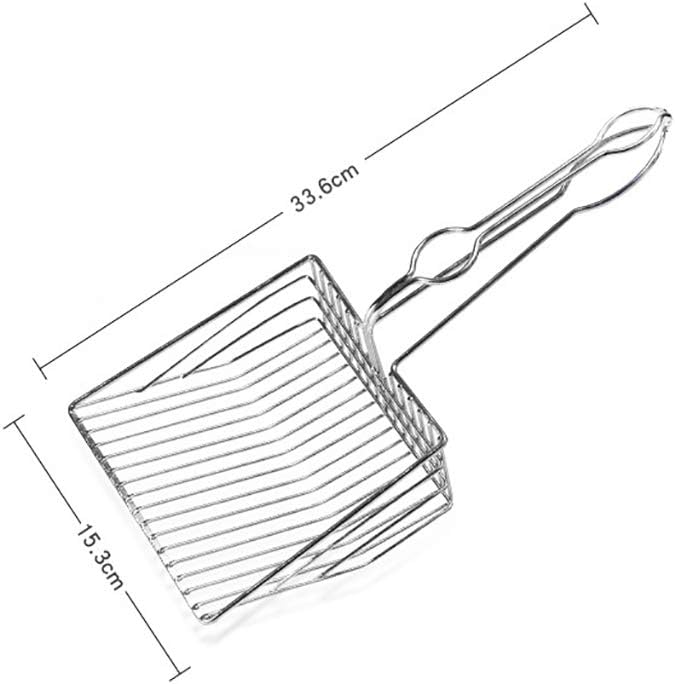 Colour: As picturePackage included:1 PcMaterial:Stainless SteelSize:The total length is about 13.23inch and the width is about 6.02inch. The error is about 0.39inch.Feature:Made of high-quality material,durable.It not only can prevent small clumps of dirty cat litter from leaking out but also can ensure that clean cat litter falls down.
