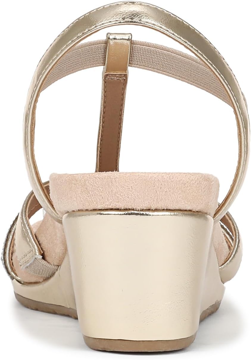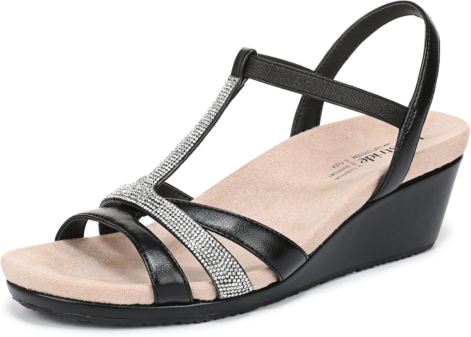 ALL-DAY COMFORT: Trusted Soft System comfort technology delivers unmatched cushion, support, and flexibility for comfortable sandals you can rely on for every occasion STYLISH ELEVATION: Subtle midsize 1.875 inch wedge heel and 0.75 inch platform provide just-right lift for versatile wedge sandals that pair perfectly with dressy looks GLAMOROUS DETAILS: Strappy cut-out upper features sparkling rhinestone embellishments and comes in multiple versatile colors for a standout look in every step EASY SLIP-ON DESIGN: Elastic ankle strap and slip-on style allow for effortless on/off, making these women's wedge sandals ideal for travel or everyday wear ENHANCED SUPPORT: Open-toe design with a cushioned footbed offers the arch support you expect from quality arch support sandals, providing comfort through every stride