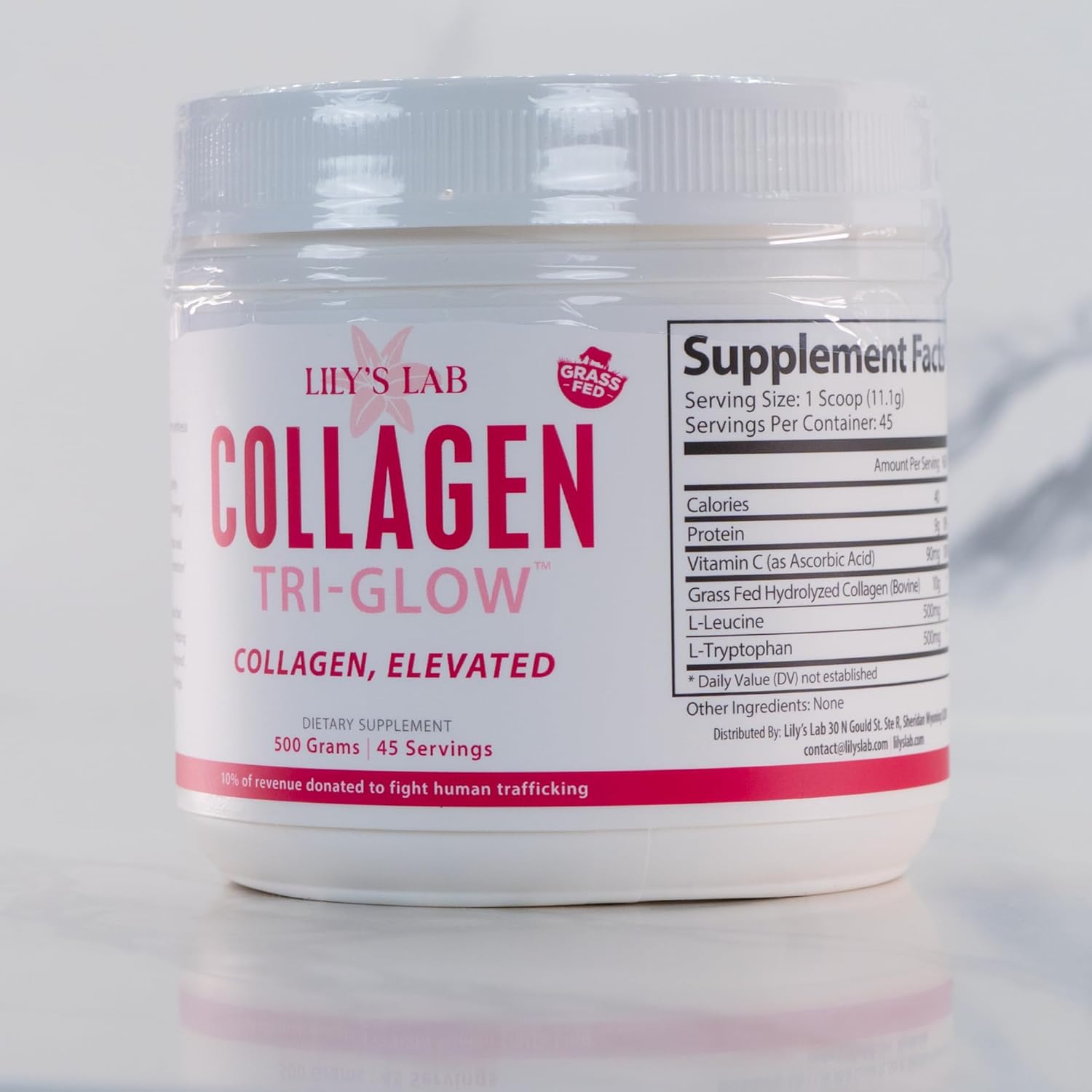 100% Grass-Fed Collagen PeptidesThe first collagen designed for body + mind.Powered by essential amino acids and nutrients that work together.The Tri-Glow Formula:L-Tryptophan — Supports natural serotonin balance for steady mood, energy, and focus.L-Leucine — Fuels muscle recovery and vitality so you feel stronger.Vitamin C — Supercharges absorption so you get the most out of every scoop.A next-generation collagen created for women who expect more—for their beauty, their wellness, and their results.10% of revenue donated to fight human trafficking.
