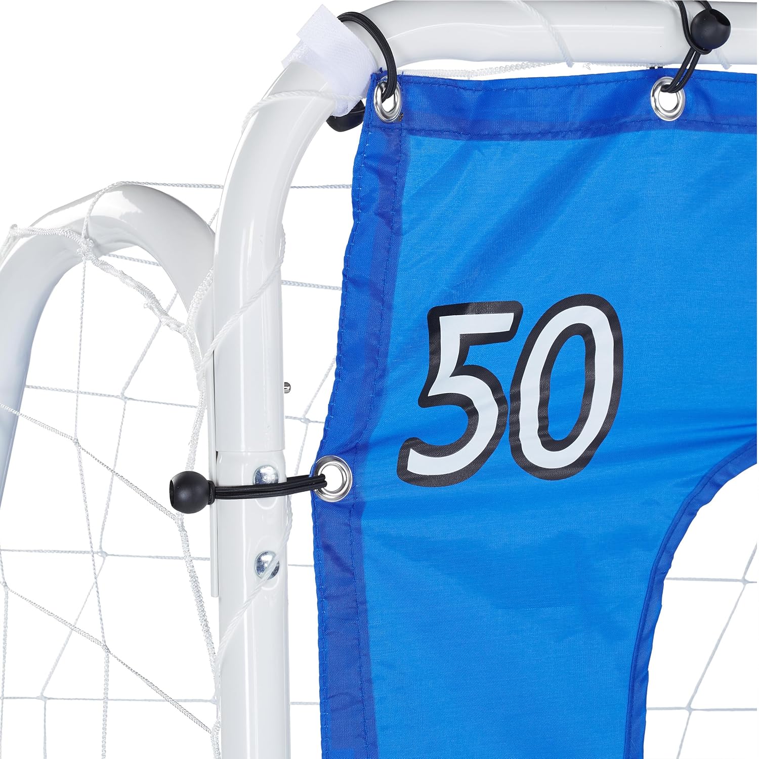 With this football goal, kids can hone their kicking technique, practise new tricks and emulate the big football stars. But the goal is also great fun for adults - whether it's a leisurely kick about after work or short training sessions. Nothing stands in the way of exciting football matches in your own garden. With the target wall that can be attached in place, you can even practise penalty kicks. The goal is quickly screwed together, and the robust net can withstand even the hardest shots.Football Goal in Detail- Size H x W x D: approx. 170 x 235 x 85 cm- Pole thickness: approx. 3 cm- Target wall H x W: approx. 155 x 228 cm- Target holes D: approx. 40 cm each- Weight: approx. 10.6 kg- Material: Steel, polyester- Colour: Blue, whiteLarge Goal with Target Wall- For exciting football matches and penalty shootouts at home- Good training equipment for big and small football fans- Fast assembly with plug-in and screw together design- Secure the durable netting with ties and hook and loops straps- Attachable target wall with 5 holes and scoring system- Sturdy white metal frame made of steel for stability- Includes pegs and ground anchors for fixing the goal to the groundIncluded in Delivery- 1 x goal to be assembled- 1 x goal net- 5 x pegs- 6 x ground anchors- 4 x ties for securing- 32 x hook and loop straps- 19 x ball tensioners- With assembly instructions- Decorative items are not included in delivery