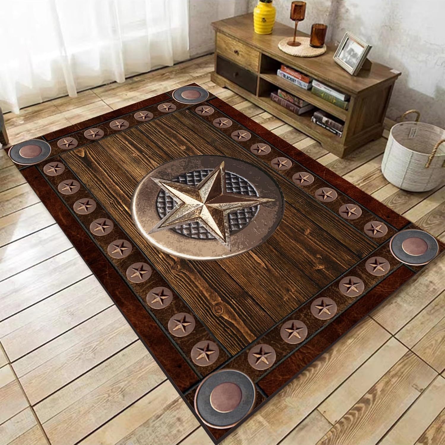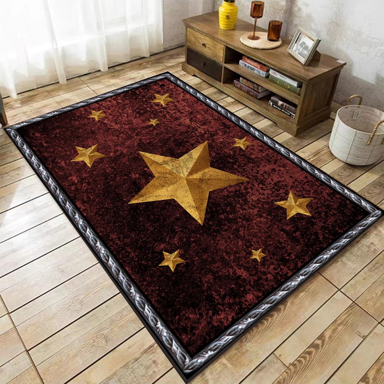 Features:①Made with low-lint, non-shedding fabric, texas star rugs are machine washable, perfect for any living room or bedroom②Rustic rugs adopts advanced spray printing technology, achieve diverse patterns, novel design, non-fading, lasting and clear③Made with durability in mind, rustic western mat are not only non-linting and pet-friendly, but also easy to clean, ensuring they stay beautiful in even the busiest of homes④Let your living space reflect the charm of rustic country decor with western star mats, and elevate your home with cowboys rugs⑤Rustic star rugs are perfect for those who love retro star carpets, and are a must-have for anyone who loves cowboys rugs and rustic rugsSize:3' x 4' /36" x 48"3' x 5' /36" x 60"4' x 5' /48" x 50"4' x 6' /48" x 72"5' x 6' /60" x 72"5' x 7' /60" x 84"5' x 8' /60" x 96"6' x 8' /72" x 96"Packing List:area rug x1Warmth Tips:1. Area rug is easy to clean. Just add some mild detergent and gently wash carpet by hands. Then put the rug in the ventilation to dry. Please do not expose it in the sun2. Our living rugs are folded and vacuum packed for protection and may have some waves or ripples when it’s first unrolled. Give it 2 to 3 days after unrolling and setting in place for the rug’s fibers to relax and lie flat