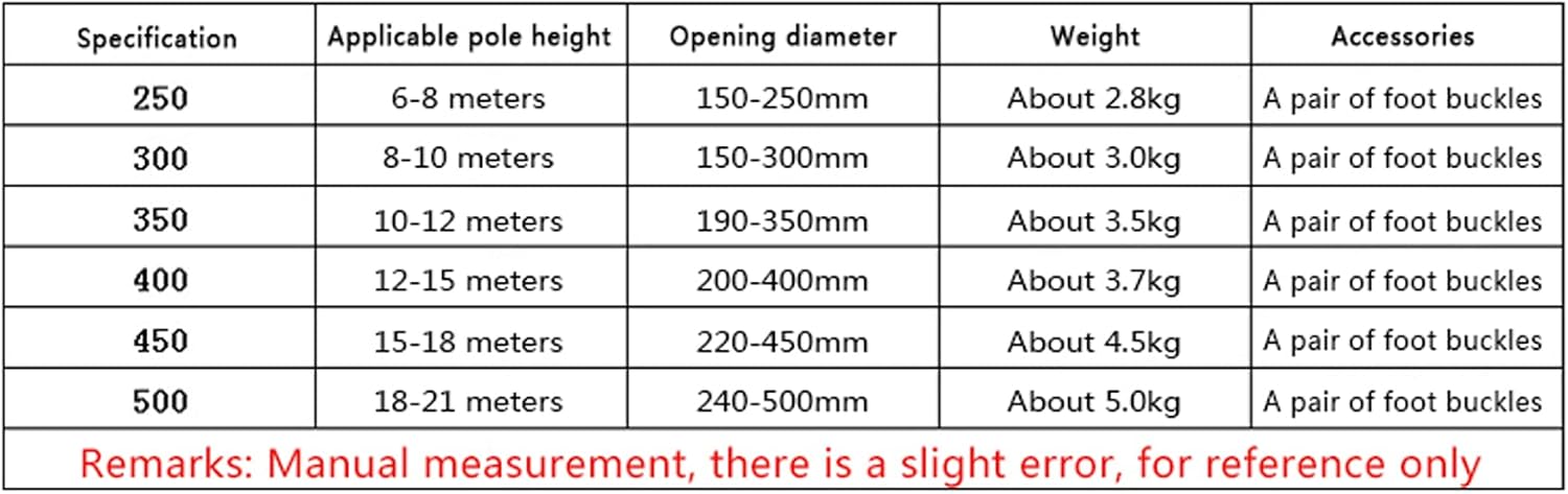- The tree climbing artifact can climb up to 10 meters from the tree in a few minutes. It is easy to use and has a high carrying capacity. This tool is very suitable for climbing trees, surviving in the jungle, picking fruits, hunting and observation.Product Specifications- Model: 250, 300, 350, 400, 450- Material: Steel- Weight: 2.8kg, 3kg, 3.5kg, 3.7kg, 4.5kg- Diameter: 150-250mm, 150-300mm, 190-350mm, 200-400mm, 220-450mm- Applicable pole height: 6-8 meters, 8-10 meters, 10-12 meters, 12-15 meters, 15-18 meters- Load: 100 (kg)Product Packing- 1 Pair of tree climbing tools- 1 BeltNote- Because of the light effect and the different computer monitors, there may be the color difference.- Size is manual measurement, there will be 1-2cm error.